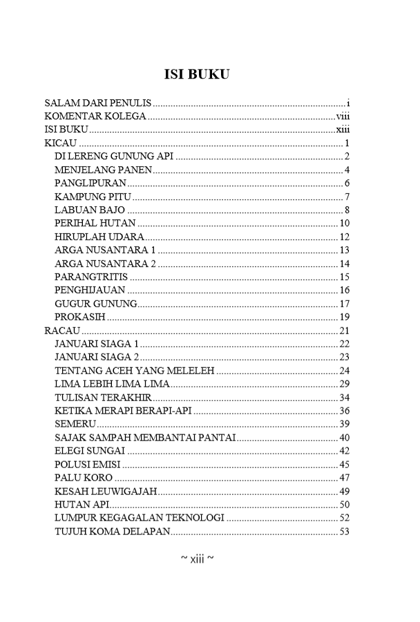 Puisi yang saya kumpulkan menjadi buku ini saya beri judul “Kicau Racau Bumi”. Buku ini terbagi dalam 3 tema yaitu tema Kicau, tema Racau dan tema Bumi.