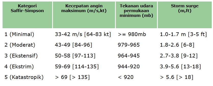 Untuk memberi gambaran kekuatan dan dampak yang bisa dihasilkan oleh Badai Tropis / Hurricane maka dibuat pedoman skala kekuatan Hurricane. Skala yang umum digunakan adalah Skala Saffir-Simpson, yang dibagi atas lima kelas kategori , yakni
