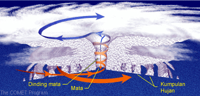 | 2 | Inti hangat; Uap air yang naik ke atmosfir yang dingin akan mengembun dan melepaskan panas. Panas buangan tersebut didistribusikan secara vertikal pada bagian inti siklon tropis yang menyebabkannya terasa hangat. |