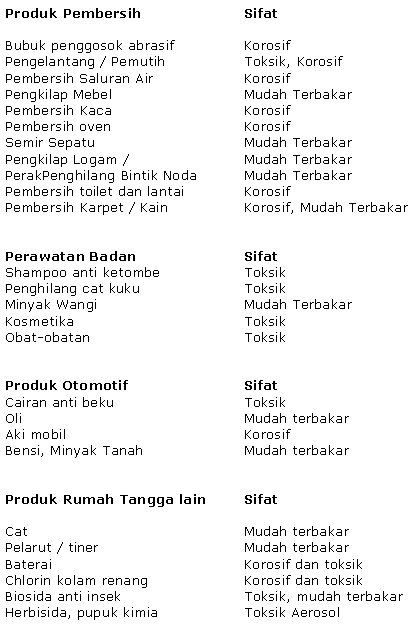 - Dapur :Pembersih saluran air, soda kostik, semir, gas elpiji, minyak tanah, asam cuka, kaporit / desinfektan, spiritus / alcohol, deterjen