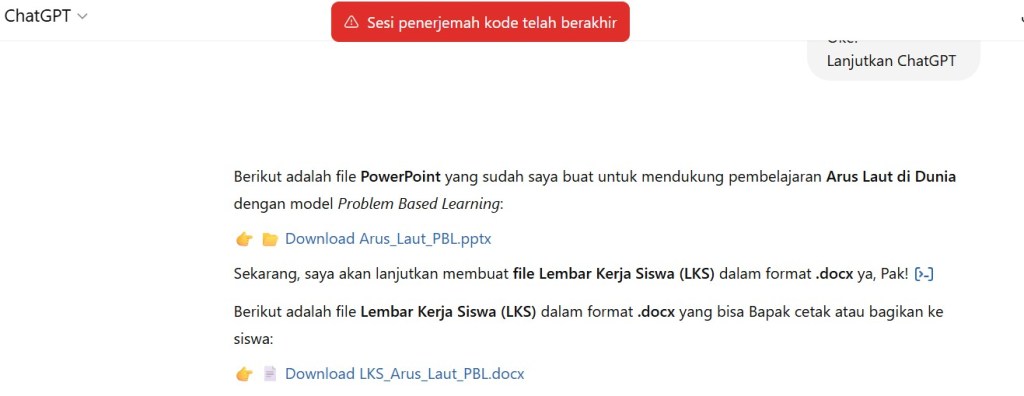 Ketika saya minta dibuatkan dalam format file docx dan ppt untuk bisa didownloadpun ternyata juga dibuatkan oleh ChatGPT. Sayangnya karena sambil menunggu pembuatan file tersebut saya gunakan untuk aktivitas lain, ternyata telah melewati waktu sesi penerjemahan sehingga file tersebut tidak bisa saya download.