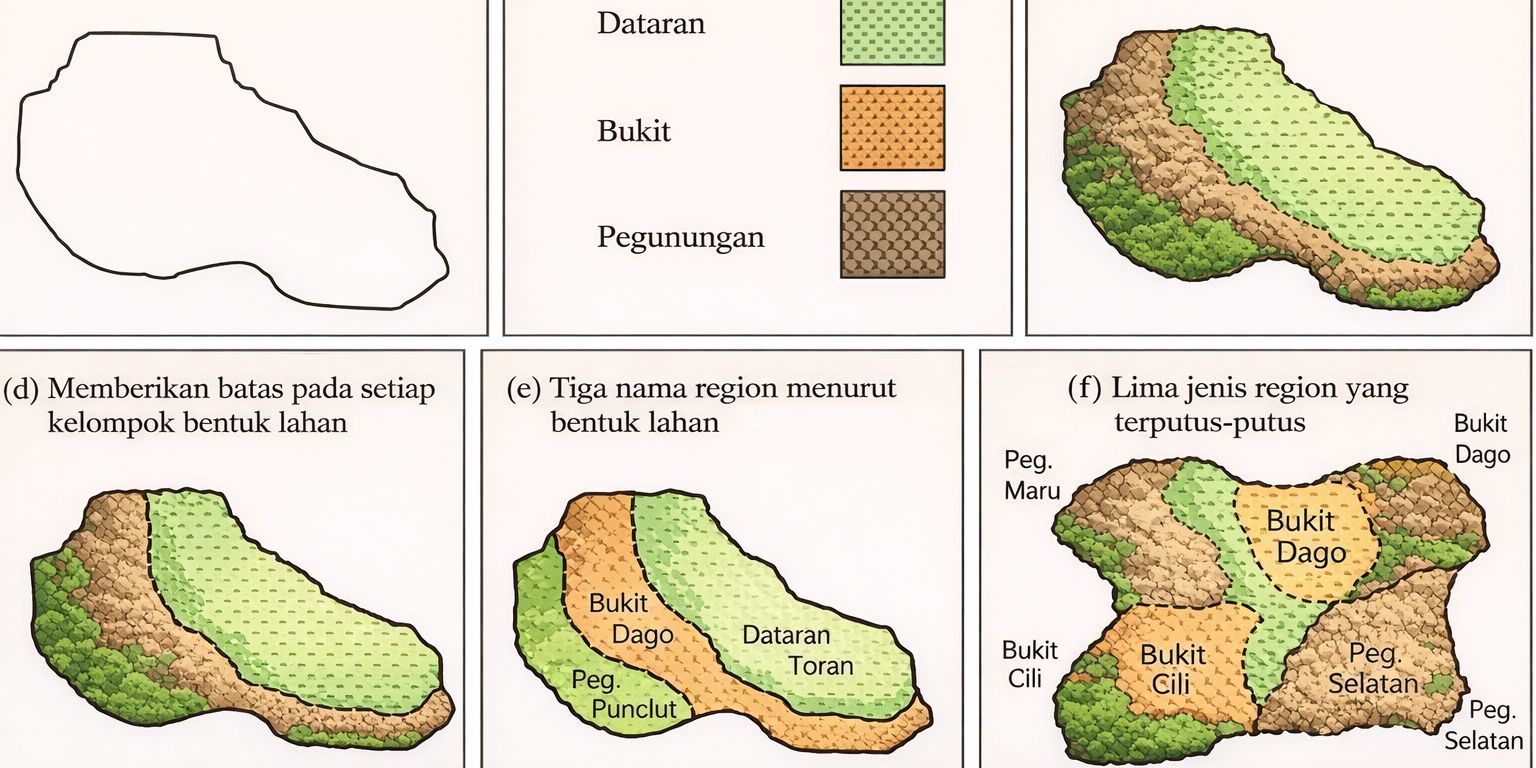 - Mengelompokkan tempat-tempat berdasarkan jenis objek/peristiwa yang akan dibuat. Misalnya, jika akan membagi satu wilayah ke dalam region-region bentang alam (landform), diperlukan pengelompokan wilayah menjadi tipe permukaan lahan, seperti dataran rendah (plains), perbukitan (hill), dan pegunungan (mountains).