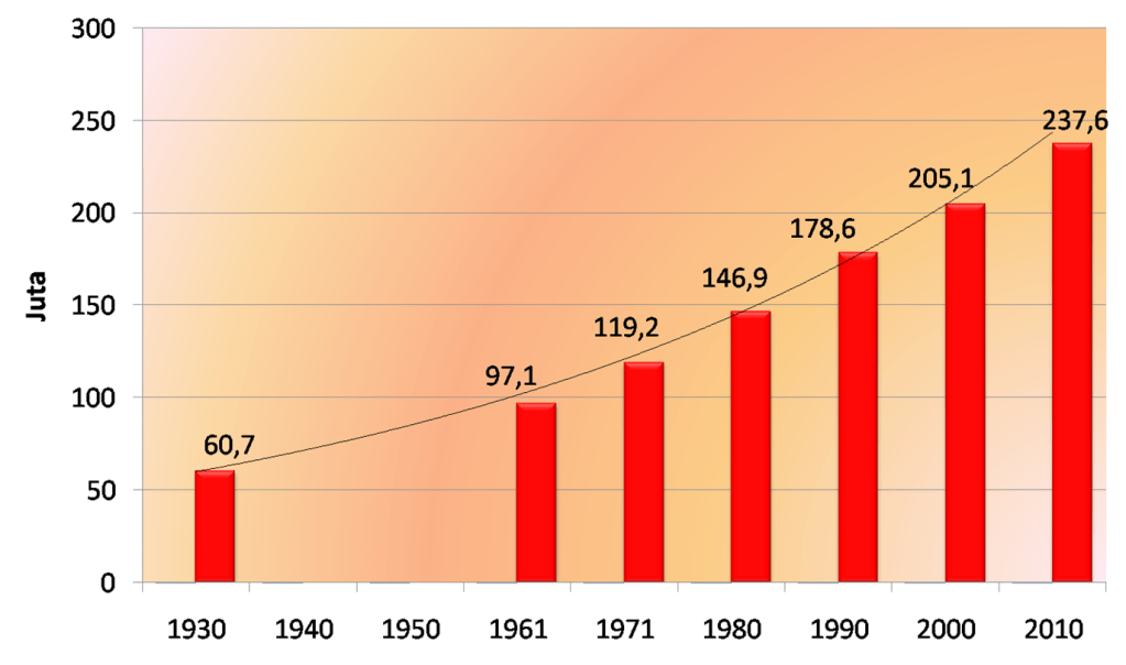 Berdasarkan gambar dari web dukcapil jakarta di atas, pada tahun 1930 dari hasil pendataan pemerintah kolonial Belanda jumlah penduduk di Indonesia mencapai 60,7 juta jiwa. Setelah merdeka jumlah penduduk Indonesia bertambah dengan pesat mencapai 237,6 juta jiwa pada tahun 2010. Ini berarti dalam kurun waktu 80 tahun penduduk Indonesia bertambah sekitar 176,9 juta jiwa atau meningkat hampir 3 kali lipat.